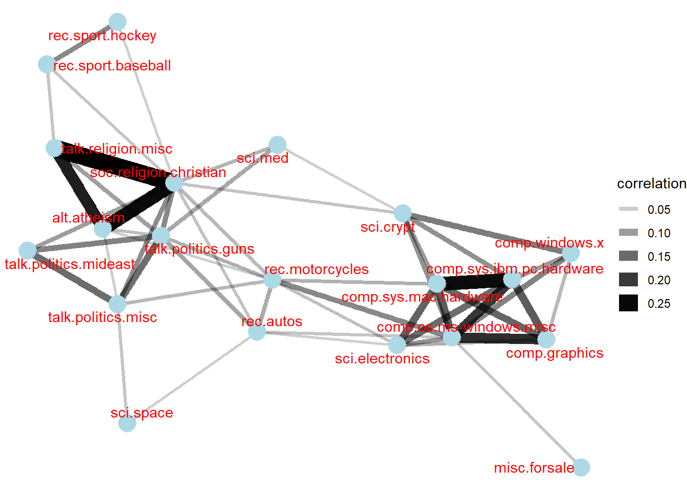 Figure below shows the frequency of messages by newsgroup.