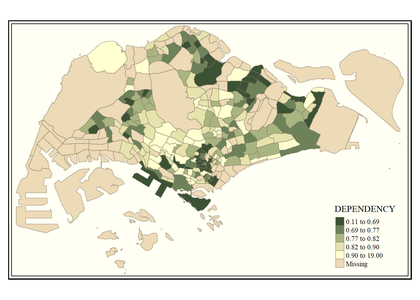 tm_layout(main.title = "Distribution of Dependency Ratio by planning subzone \n(Jenks classification)",
