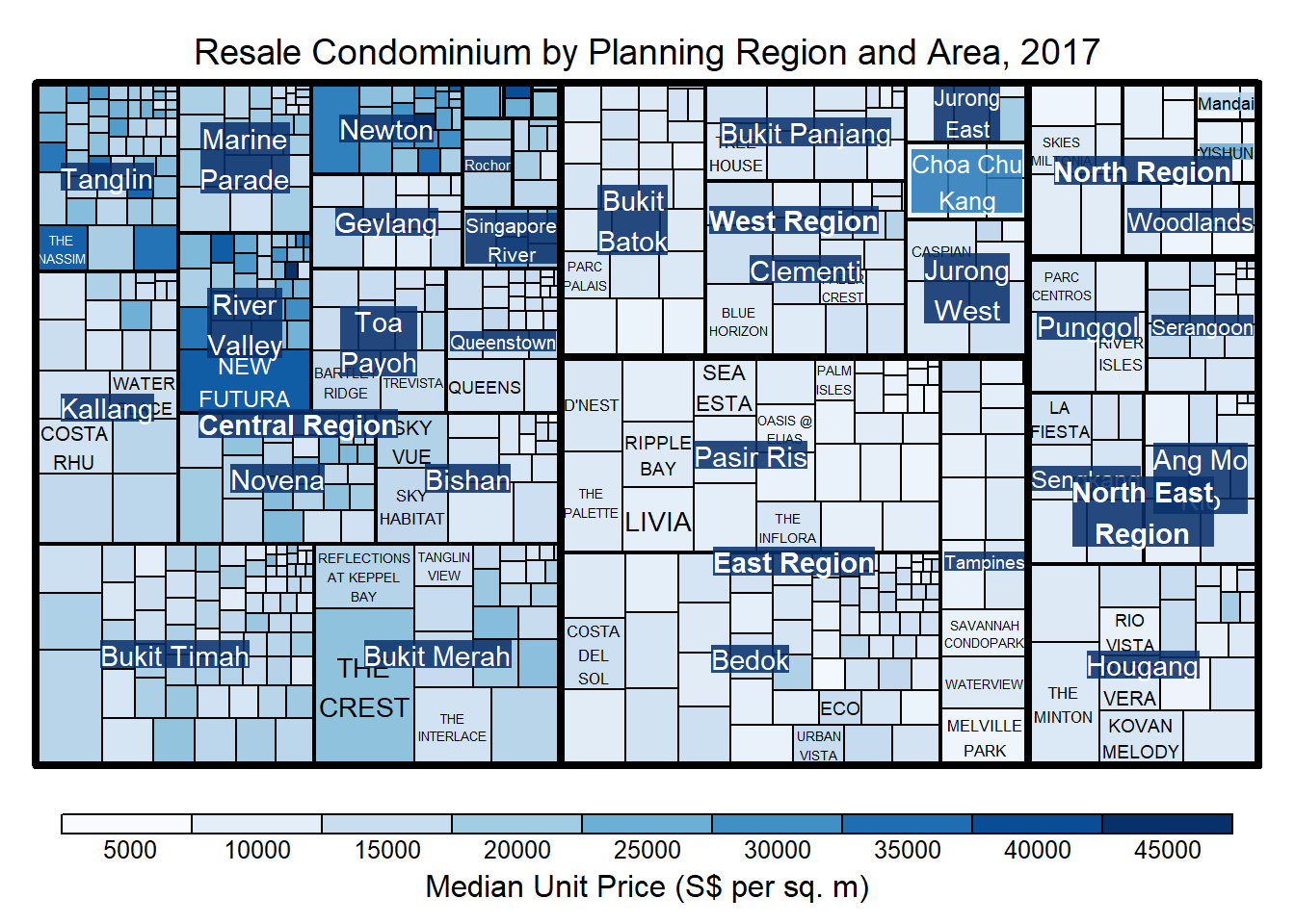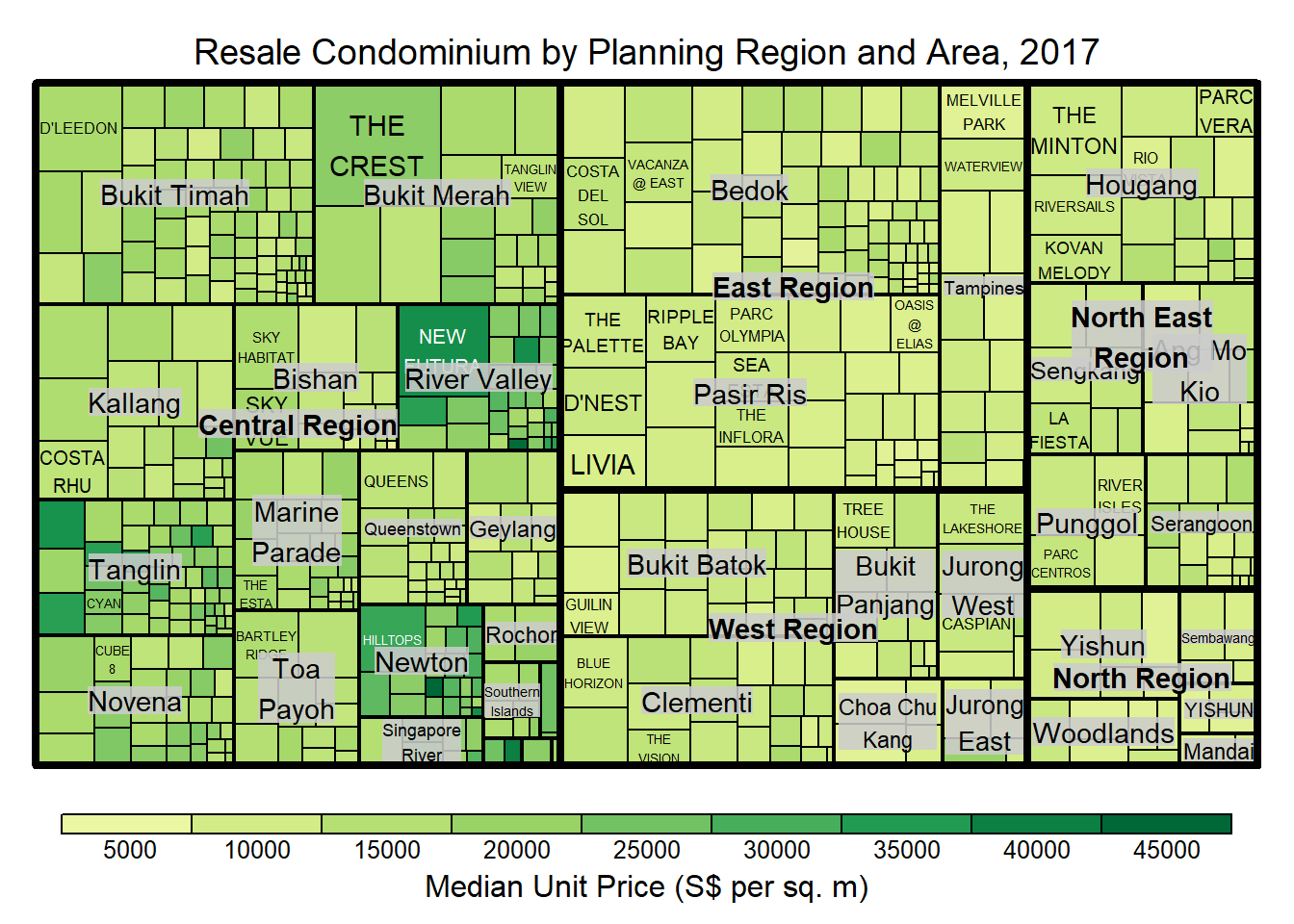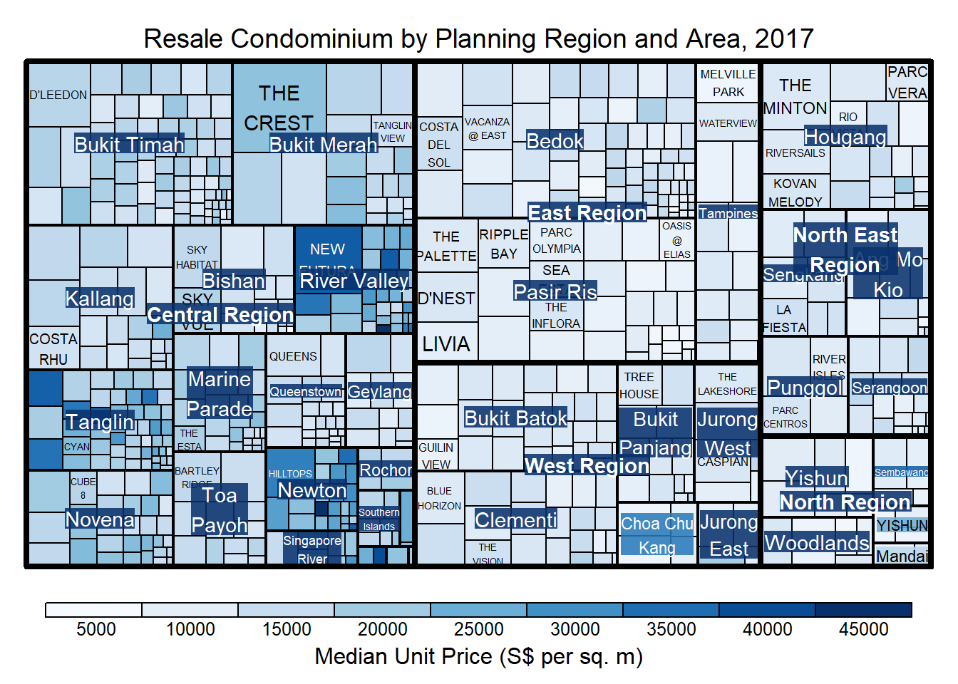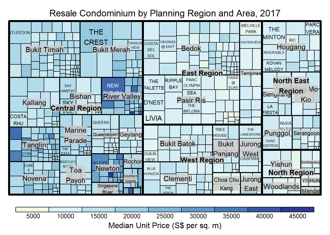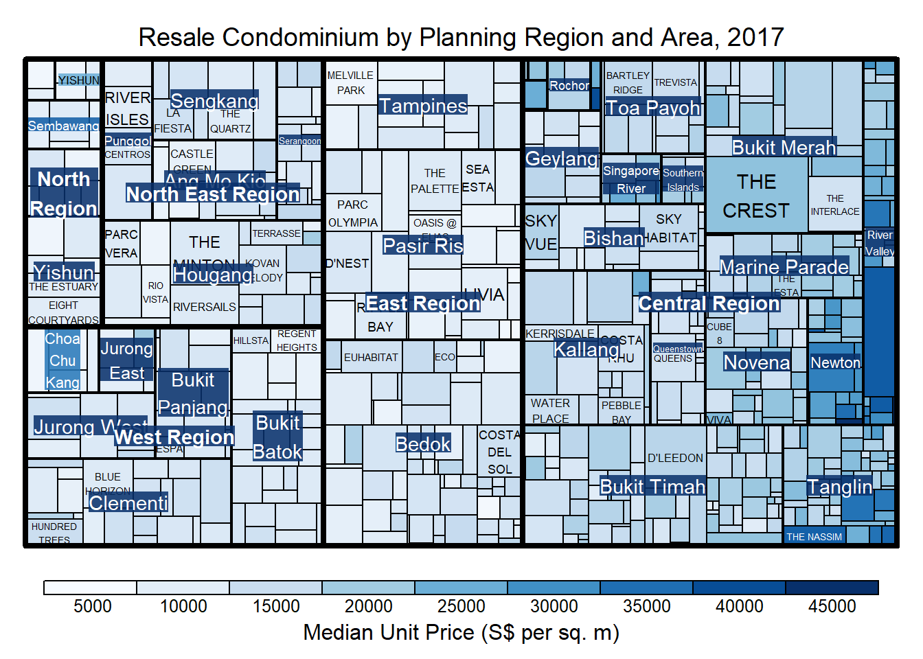 treemap() of Treemap package is used to plot a treemap showing the distribution of median unit prices and total unit sold of resale condominium by geographic hierarchy in 2017.