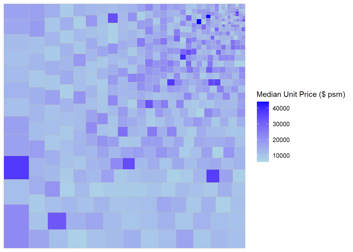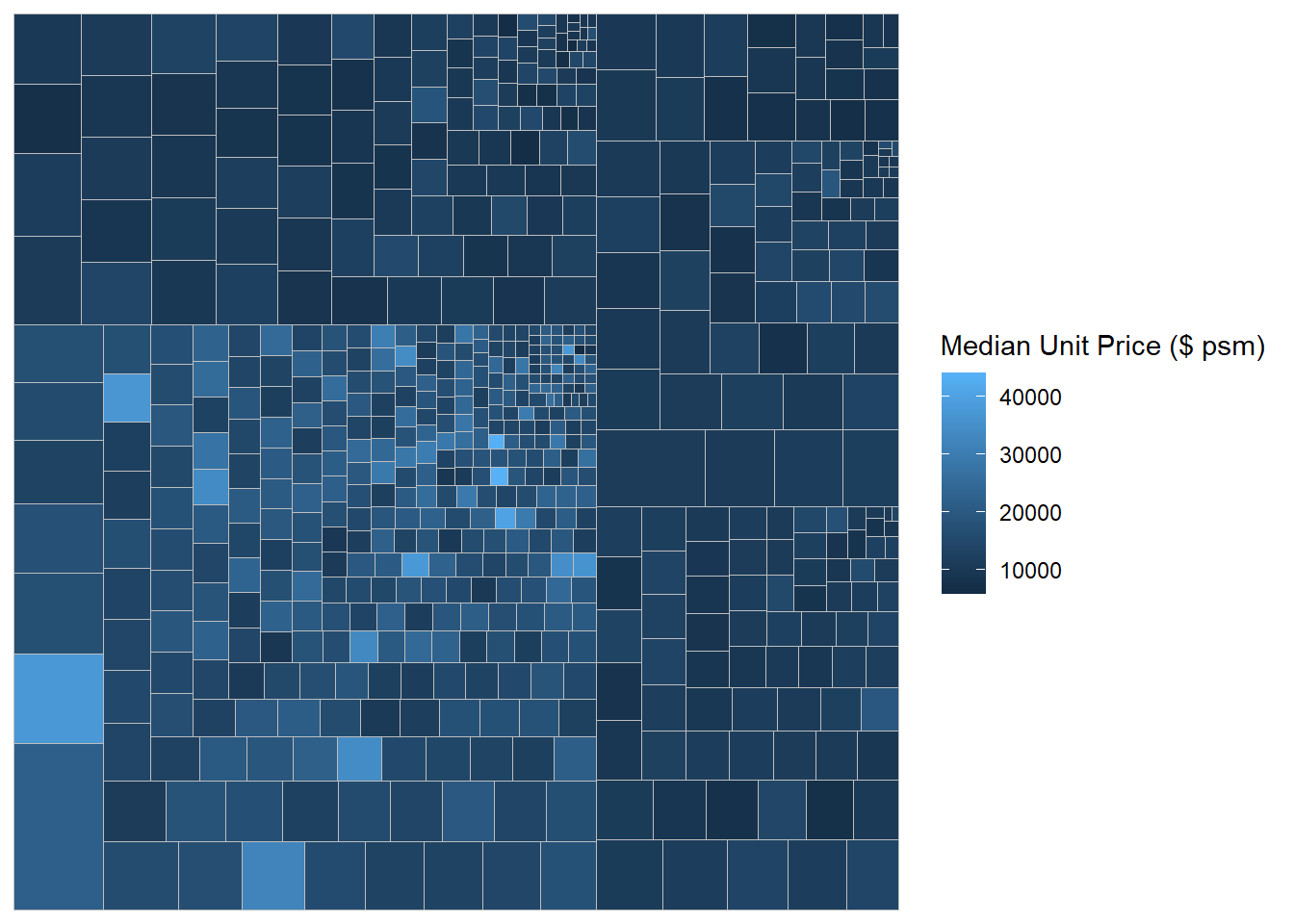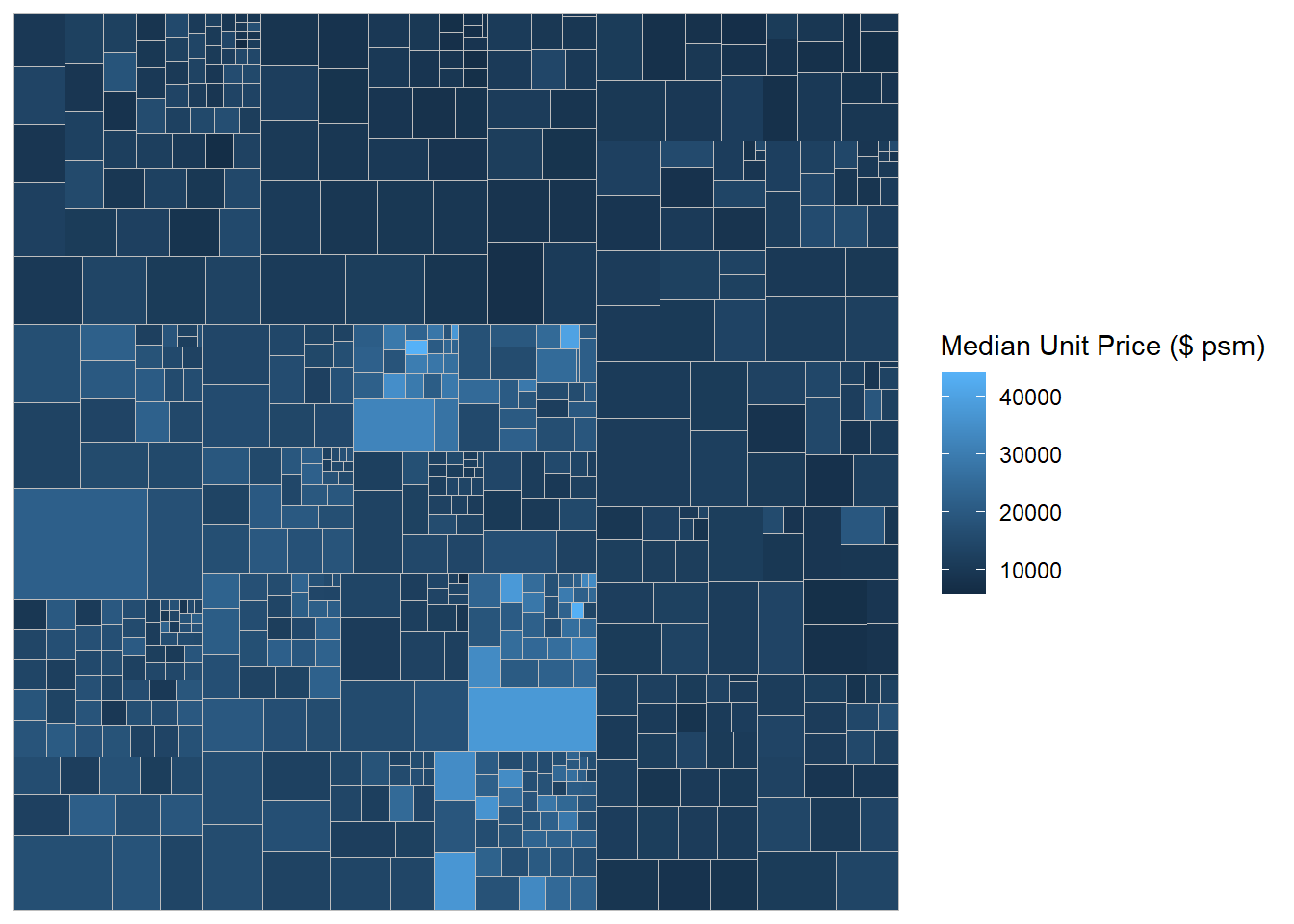 )The rectangles are coloured with different intensity of green, reflecting their respective median unit prices.