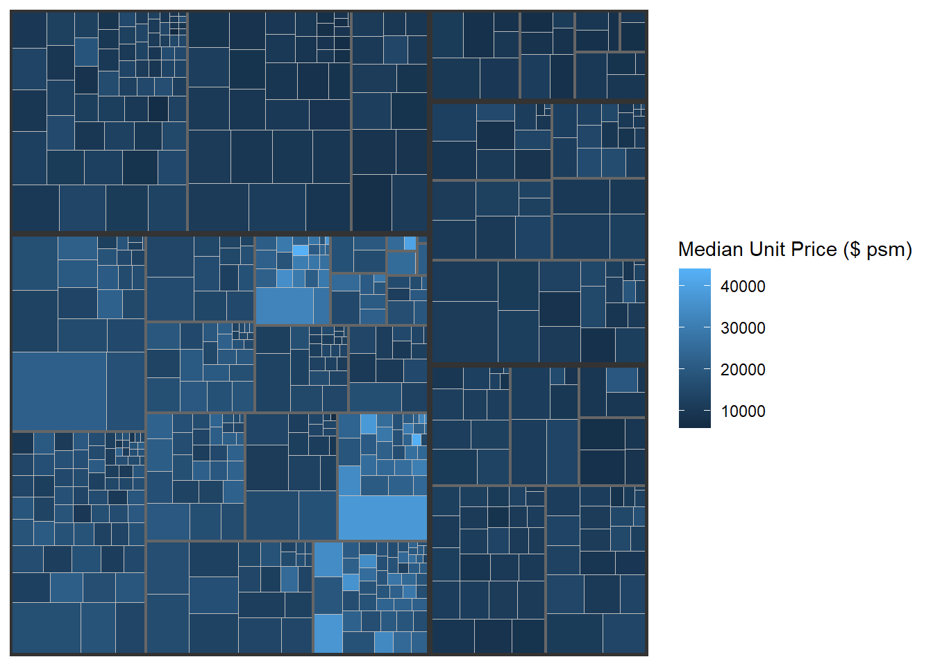 )Although the colour palette used is RdYlBu, there are no red rectangles in the treemap above. This is because all the median unit prices are positive.